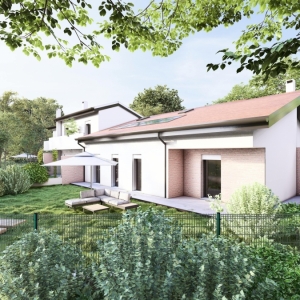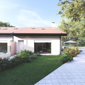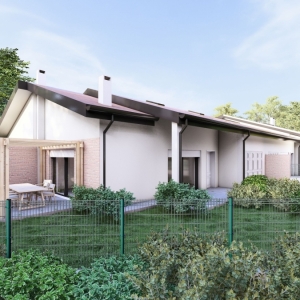Le unità si sviluppano su due livelli e presentano una distribuzione interna funzionale e luminosa. La zona giorno è ampia e accogliente, caratterizzata da grandi vetrate che creano continuità tra interno ed esterno e valorizzano il giardino privato. La cucina si integra armoniosamente nello spazio living, con possibilità di personalizzazione secondo le proprie esigenze abitative. La zona notte offre tre camere da letto di generose dimensioni e due bagni finestrati, garantendo comfort e praticità per tutta la famiglia. Ogni abitazione dispone inoltre di garage collegato direttamente all’interno e di spazi esterni esclusivi fronte e retro, ideali per momenti di relax all’aperto.